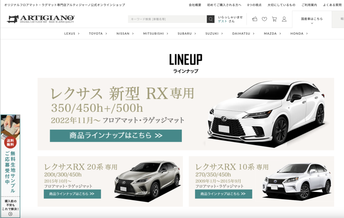 レクサスオーナーの方が使われている社外品のフロアマットを探していたところ、FJ CRAFTの他に、アルティジャーノというメーカーの製品を使用されている方が多いことが分かりました。
